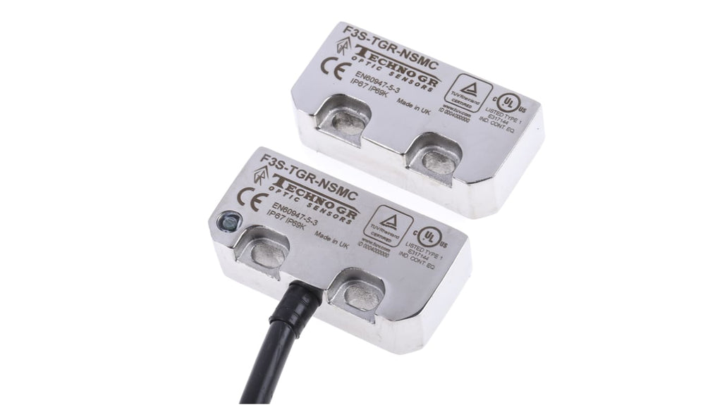 Interruttore di sicurezza senza contatto Omron, tensione di alimentazione 24V cc, contatti 1NA e 2NC, materiale custodia in acciaio inox, connessione con cavo di 5m, attuatore incluso, distanza di commutazione 17mm, grado di protezione IP67, categoria di sicurezza 4, dimensioni 50mm x 51mm x 13mm, conforme a EN 954-1, EN ISO13849-1, EN 60204-1, EN/IEC 60947-5-3, UL 508, CSA C22.2, BS 5304, EN1088-1.