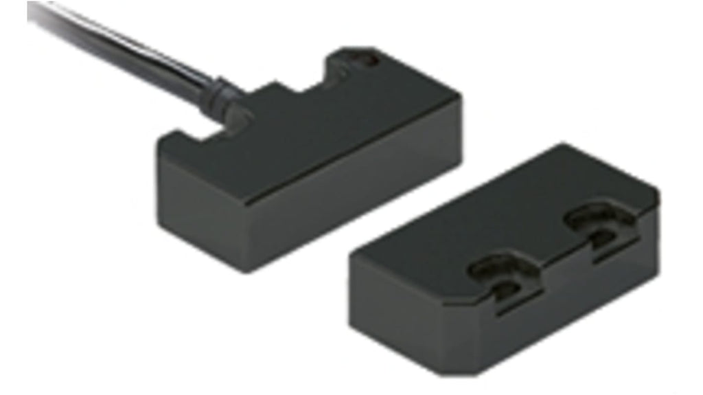 Interruttore di sicurezza senza contatto Omron F3S-TGR, tensione 24V cc, contatti NA, cavo da 10 m. Design RFID con codifica unica, resistenza alla manomissione, collegamento di 20 interruttori in serie. LED per diagnosi, protezione IP69K, connettore M12 IP67, corrente fornita 30mA. Dimensioni 88mm x 25mm x 13mm, materiale plastico, conforme a PLe acc. EN ISO 13849-1. Attuatore incluso.