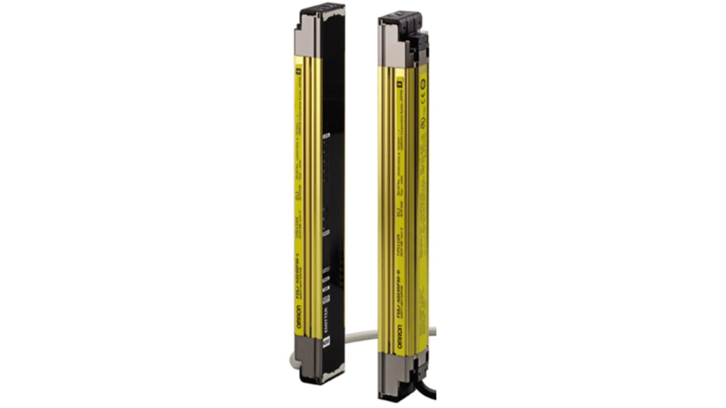 Barriera fotoelettrica Omron F3SJ Advanced, 19 fasci, risoluzione 30 mm, tipo di sicurezza 4, autodiagnosi, facile montaggio e gestione, supporta protezione delle dita, funzioni di silenziamento e blanking per aumento produttività. Componenti: ricevitore e trasmettitore.