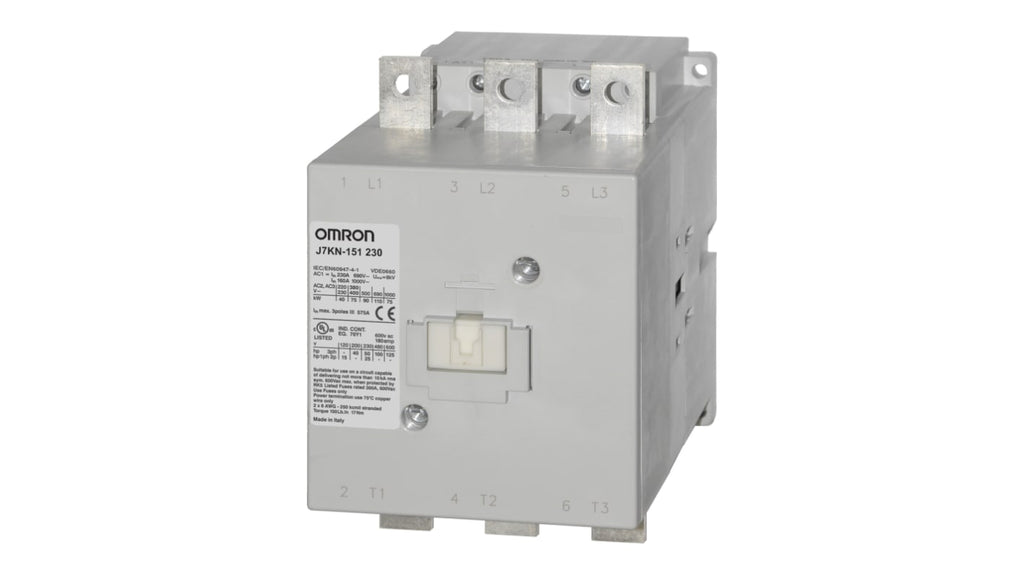 Contattore Omron, 3 poli, corrente nominale 150 A, potenza nominale 75 kW, tensione bobina 230 V c.a., collegamento elettrico a vite e raccordo a scatto su guida DIN, dimensioni H290 x W110 x D162 mm, temperatura ambiente d'esercizio da -40 a 60 °C, a prova di dita.
