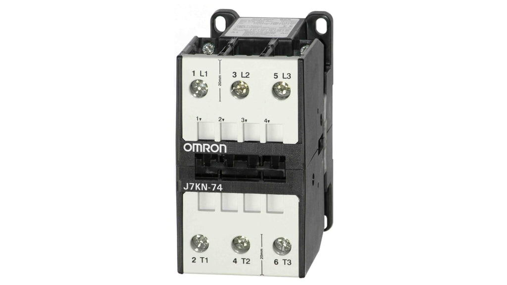 Contattore Omron, 3 poli, alimentazione 230 V c.a., corrente nominale 74 A, potenza nominale 37 kW, conforme agli standard globali. Accessori disponibili: contatti ausiliari montati sul lato anteriore o laterale, dispositivi di blocco meccanico, unità soppressori. Modello J7KN-74 230.
