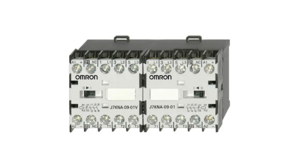 Contattore reversibile Omron, 3 poli, 3 NA, 9 A, 4 kW, bobina 24 V c.a., collegamento elettrico a vite, raccordo a scatto su guida DIN, dimensioni H57.5 x W94.5 x D50 mm, temperatura ambiente d'esercizio da -40 a 60 gradi Celsius, a prova di dita, 2 contatti ausiliari, 1 NC.