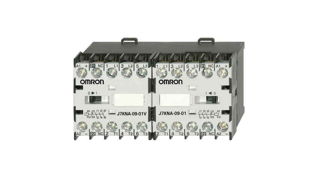 Contattore reversibile Omron, 3 poli, 3NO, 9 A, 4 kW, bobina 24 V c.c., collegamento elettrico a vite e raccordo a scatto su guida DIN, dimensioni H57.5 x W94.5 x D50 mm, temperatura ambiente d'esercizio da -40 a 60 gradi Celsius, a prova di dita, 2 contatti ausiliari, 1NC.