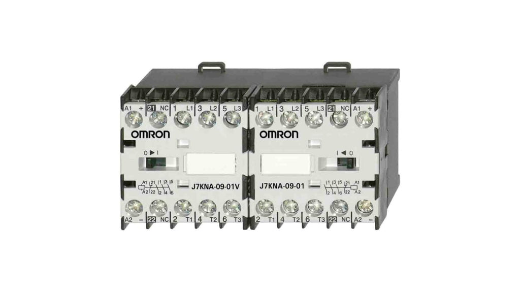 Contattore reversibile Omron, serie J7KNA, 3 poli, 3NO, corrente nominale 9 A, potenza nominale 4 kW, tensione bobina 230 V C.A., configurazione contatti ausiliari 1NC, numero contatti ausiliari 2, morsetti a vite.