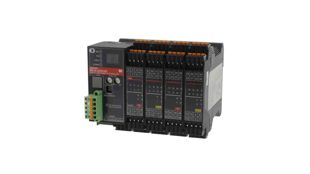 Modulo di ingresso/uscita Omron NE1A, 24 V c.c., 40 ingressi PNP, 8 uscite PNP, 8 uscite di prova, interfaccia di sicurezza USB e DeviceNet, 254 terminali con morsetto a gabbia rimovibili, display con LED per diagnostica avanzata, set di istruzioni predefinito e certificato per programmazione semplice.