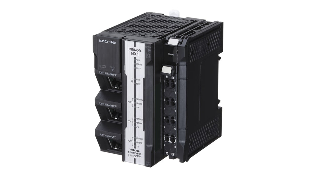 CPU PLC per automazione industriale, modello NX102, alimentazione 24 V c.c., dimensioni 68,1 x 90 x 103 mm, montaggio a pannello, tre porte Ethernet industriali, interfaccia di programmazione Ethernet, capacità programma 5 MB, supporto fino a 12 assi di controllo EtherCAT, fino a 32 unità I/O NX locali, funzionalità server OPC UA, temperatura operativa da 0 a 55 gradi Celsius, linguaggio di programmazione diagramma ladder.