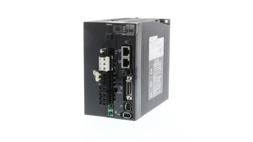 Servocomando trifase Omron, potenza nominale 0,6 kW, tensione di alimentazione 400 V c.a., frequenza di risposta 2 kHz, encoder a 20 bit per alta risoluzione, sintonizzazione automatica in tempo reale, ingresso encoder esterno per anello chiuso. Codice costruttore R88D-KN06F-ECT.