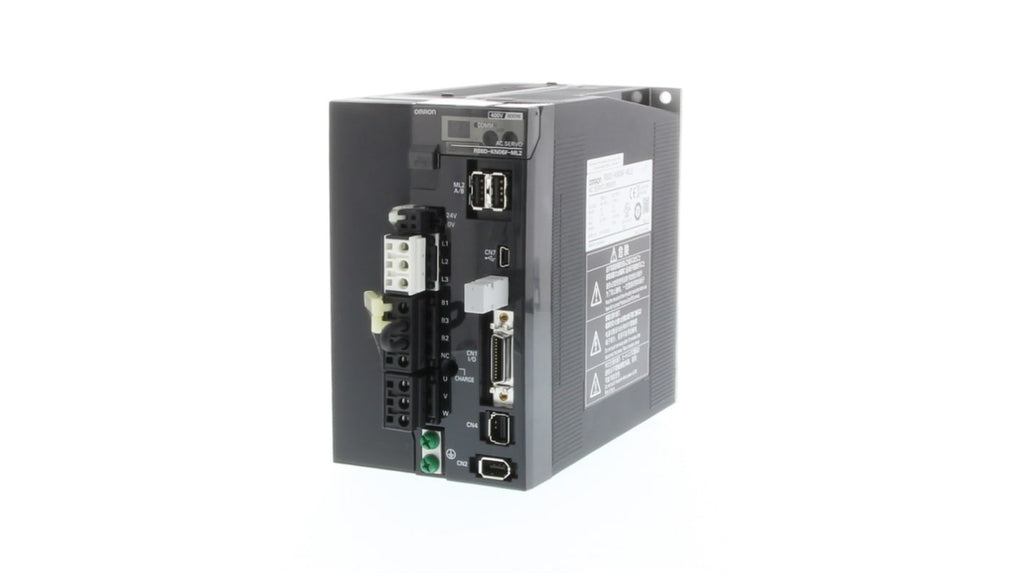 Servocomando Omron, 3 fasi, 0,6 kW. Potenza nominale 0,6 kW, coppia nominale 2,86 Nm, tensione di alimentazione 400 V, frequenza di risposta 2 kHz, encoder a 20 bit, sintonizzazione automatica in tempo reale, ingresso encoder esterno per anello chiuso. Codice costruttore R88D-KN06F-ML2.