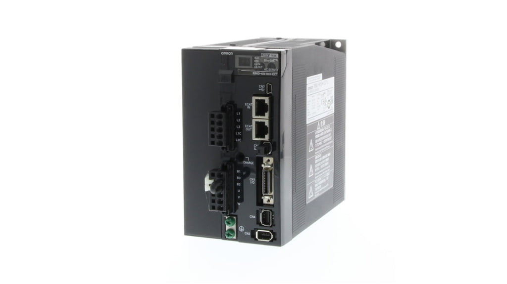 Servocomando Omron per controllo di movimento, 1 fase, tensione di alimentazione 200-240 V, corrente nominale 14,2 A, potenza nominale 1,5 kW, tensione nominale 250 V. Dotato di EtherCAT, encoder a 20 bit, sintonizzazione automatica in tempo reale, conformità di sicurezza ISO13849-1 PL-d, elevata frequenza di risposta di 2 kHz, funzionalità analogico/a impulsi. Codice costruttore R88D-KN15H-ECT.