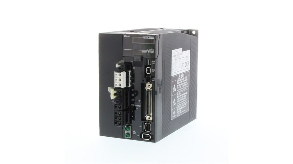 Servocomando Omron, 3 fasi, 0,6 kW, 400 V. Potenza nominale 600 W, coppia nominale 1,91 Nm, frequenza di risposta 2 kHz, alta risoluzione con encoder a 20 bit, sintonizzazione automatica in tempo reale, ingresso encoder esterno per anello chiuso. Codice costruttore R88D-KT06F.