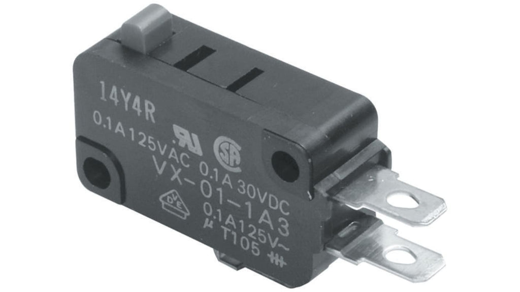 Microinterruttore SPDT, Omron, corrente nominale 5 A a 250 V c.a., protezione IP40, forza di azionamento ultra bassa 0,49 N, terminali a saldare/ad attacco rapido, temperatura operativa da -25 a +80 gradi, durata meccanica 50 milioni di operazioni, conforme RoHS, omologazioni UL, CSA, VDE, TUV, SEMKO, contenitore stile V3, materiale contatto lega di argento.