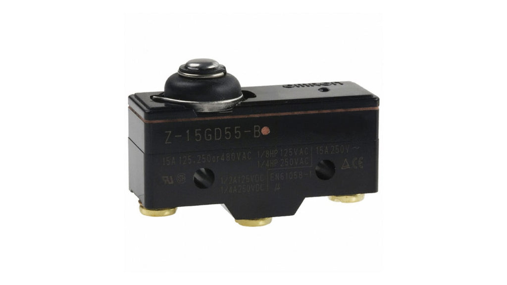 Interruttore di fine corsa Omron, pistone a molla, configurazione SPDT, contatti NO/NC, grado di protezione IP62, corrente massima 15 A, tensione massima 500 V ca, custodia in plastica, temperatura d'esercizio da -25 a 80 gradi Celsius, serie Z. Riconoscimenti UL e CSA.