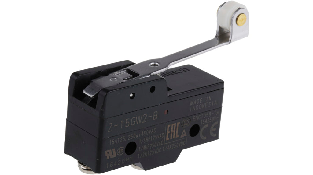Interruttore di fine corsa Omron, leva a rullo, configurazione SPDT, NO/NC, tensione massima 500V, corrente massima 15A, protezione IP00, durata meccanica 10 milioni di cicli, temperatura operativa da -25°C a +80°C, dimensioni 39,4mm x 49,2mm x 17,45mm, metodo di connessione a terminali a vite, autorizzazioni UL e CSA. Serie Z, modello Z-15GW2-B.