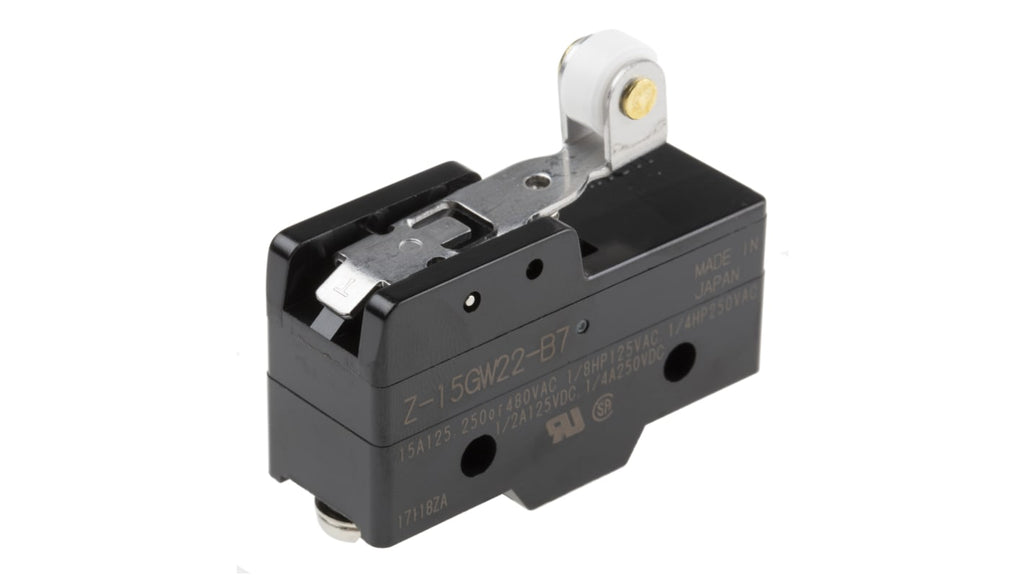 Interruttore di fine corsa Omron, leva a rullo, configurazione SPDT, contatti NO/NC, tensione massima 500V, corrente massima 15A, grado di protezione IP00, azione rapida, custodia in resina termoindurente, durata meccanica 20000000 operazioni, temperatura operativa da -25 a +80 gradi Celsius, dimensioni 49.2mm x 29.4mm x 17.45mm, codice costruttore Z-15GW22-B7-K.