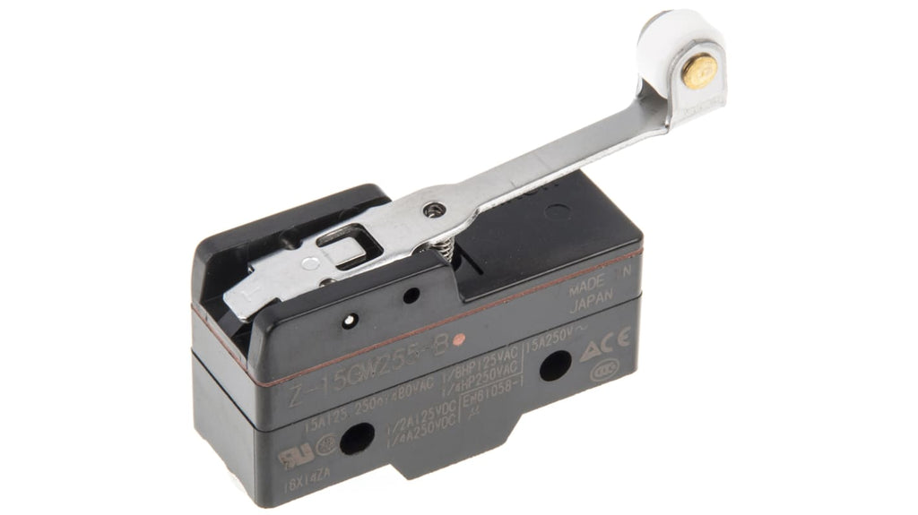 Interruttore di fine corsa Omron, leva a rullo, configurazione SPDT, contatti NO/NC, tensione massima 500V, corrente massima 15A, protezione IP00, durata meccanica 10 milioni di cicli, temperatura operativa da -25 a +80 gradi Celsius, metodo di connessione a terminali a vite, dimensioni 39.4mm x 49.2mm x 17.45mm, codice costruttore Z-15GW255-B.