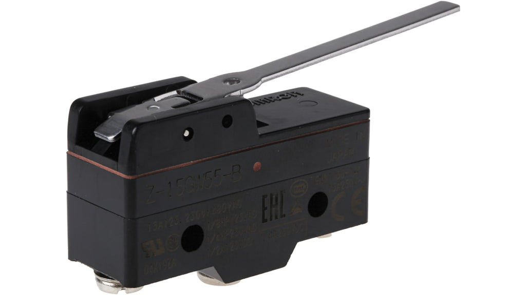 Interruttore di fine corsa Omron, leva, configurazione SPDT, contatti NO/NC, tensione massima 500V, corrente massima 15A, protezione IP00, durata meccanica 10 milioni di cicli, temperatura operativa da -25 a +80 gradi, metodo di connessione a terminali a vite, dimensioni 28.2mm x 49.2mm x 17.45mm, codice costruttore Z-15GW55-B, autorizzazioni UL e CSA.