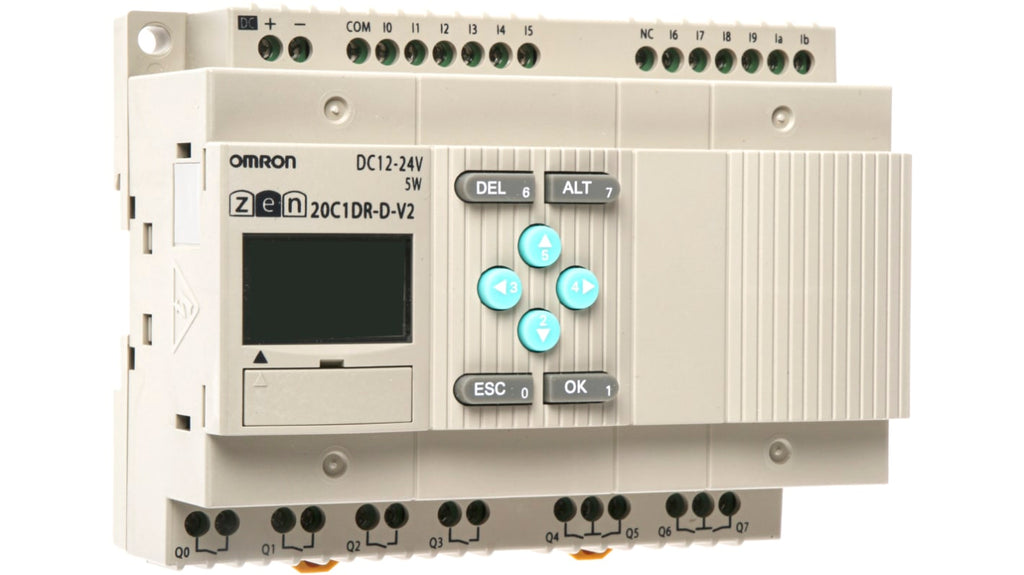 Modulo logico per guida DIN, Omron ZEN, 12 ingressi, 8 uscite relè, contatti 30A, tensione di alimentazione 12-24 VDC, temperatura operativa 0-50 °C, programmazione ladder Logic, display LCD, interfaccia di programmazione computer, dimensioni 94,7 x 70 x 56 mm, porta di comunicazione RS485, facile espansione con unità I/O. Certificazione CE.