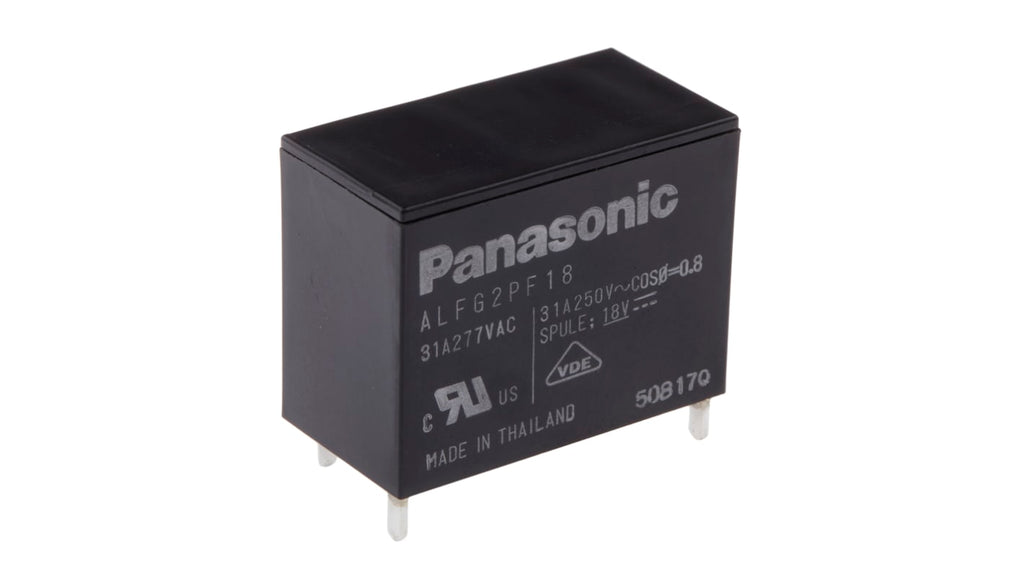 Relè di potenza Panasonic, SPST, bobina 18V cc, montaggio su circuito stampato. Tensione di mantenimento ridotta fino al 35% della tensione nominale, corrente di commutazione 31A, potenza bobina 1.4W, vita 1.000.000 cicli elettrici. Isolamento bobina-contatto 4kV, massima temperatura operativa +60°C, minima -40°C. Applicazioni: inverter solari, alimentatori continui, attrezzature per ufficio. Certificazioni UL, C-UL, VDE. Dimensioni: 30.1mm x 15.7mm x 23.3mm.