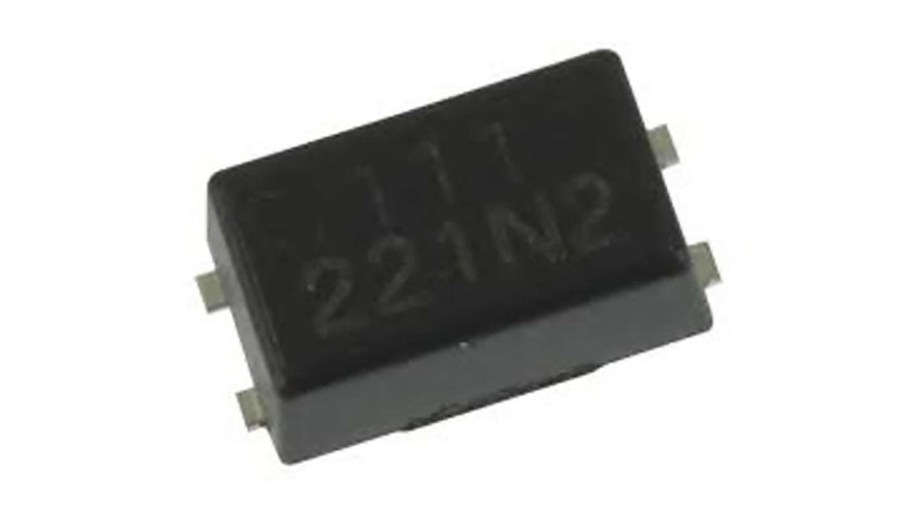 Relè a stato solido per montaggio superficiale, corrente di carico massima 0,75 A, tensione di carico massima 40 V, tensione minima di carico 15 V, tipo switching c.a. / c.c., configurazione contatto SPST, uscita MOSFET, serie PhotoMOS, resistenza di ingresso incorporata, bassa resistenza in stato attivo, dimensioni compatte per ottimizzazione spazio su scheda PC. Codice costruttore AQY221FR2V, marchio Panasonic.