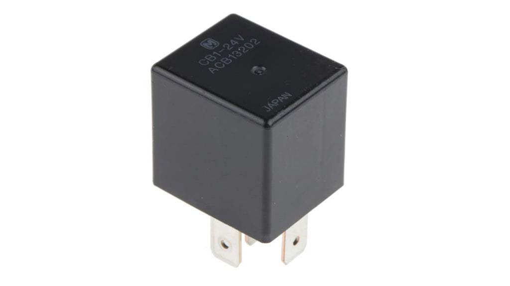 Relè per automotive Panasonic, 24V cc, 20A, SPDT, A innesto. Tensione bobina 24V cc, potenza bobina 1.8W, resistenza bobina 320Ω, corrente di commutazione 20A, potenza di commutazione massima CC 560W. Disposizione terminali mini-ISO, compatto (22 x 26 mm), altezza 36 mm, temperatura operativa da -40°C a +85°C, vita 106 cicli, materiale contatto argento, isolamento bobina-contatto 500V.