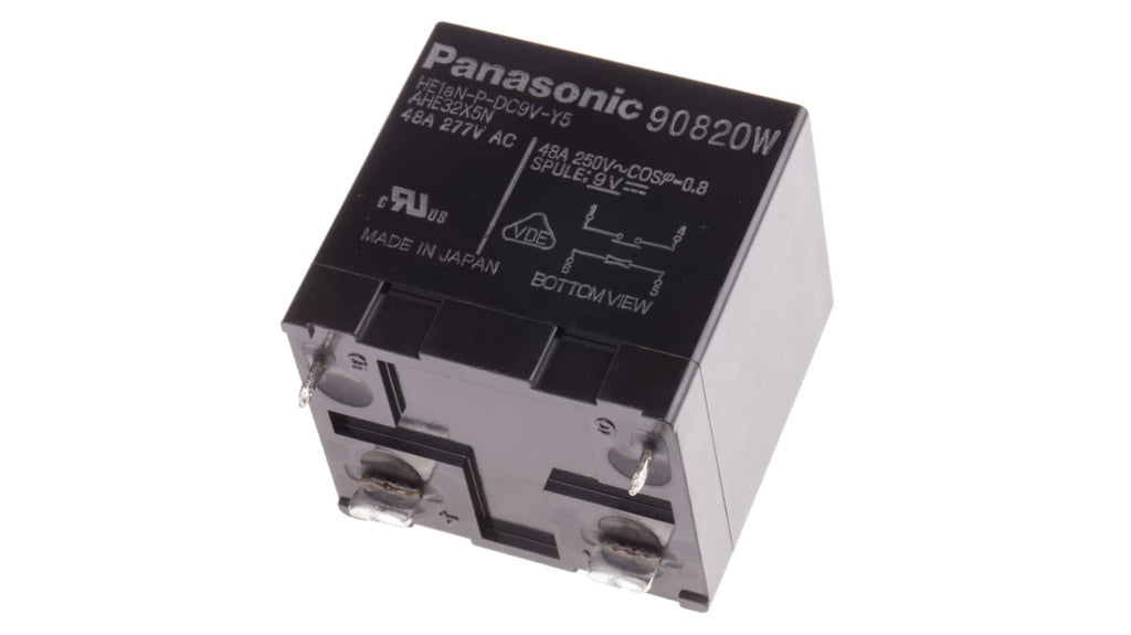 Relè di potenza Panasonic, SPST, bobina 9V cc, montaggio su circuito stampato. Tensione bobina 9V cc, corrente di commutazione 48A, potenza bobina 1.92W, isolamento bobina-contatto 5kV. Dimensioni 38mm x 36.3mm x 33mm, temperatura operativa da -50°C a +55°C. Materiale contatto in lega di argento, vita elettrica 10 milioni di cicli. Certificazioni SCA, VDE, TUV. Applicazioni: macchine utensili, condizionatori d'aria, impianti di riscaldamento.
