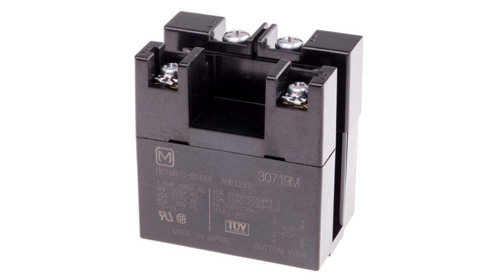 Relè di potenza Panasonic, SPST, bobina 48V cc, montaggio su circuito stampato, corrente di commutazione 30A, tensione di commutazione massima CA 277V, tensione di commutazione massima CC 30V, potenza bobina 1.92W, vita 100000 cicli elettrici, 10000000 cicli meccanici, isolamento bobina-contatto 5kV RMS, temperatura operativa da -50 a +55 gradi, dimensioni 50mm x 16.5mm x 44.5mm, materiale contatto lega di argento.