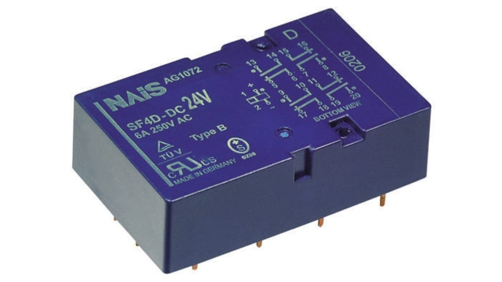 Relè di sicurezza monostabili serie SF2D, tensione bobina 5V cc, montaggio su circuito stampato, configurazione contatto DPDT, 2 poli, corrente di commutazione 6A, potenza bobina 500mW, vita 100000 cicli elettrici, 10000000 cicli meccanici, temperatura operativa da -40 a +70 gradi Celsius, isolamento bobina-contatto 2.5kV rms, autorizzazioni TÜV, UL, CSA, VDE. Dimensioni: 53.3mm x 25mm x 16mm. Materiale contatto placcato oro.