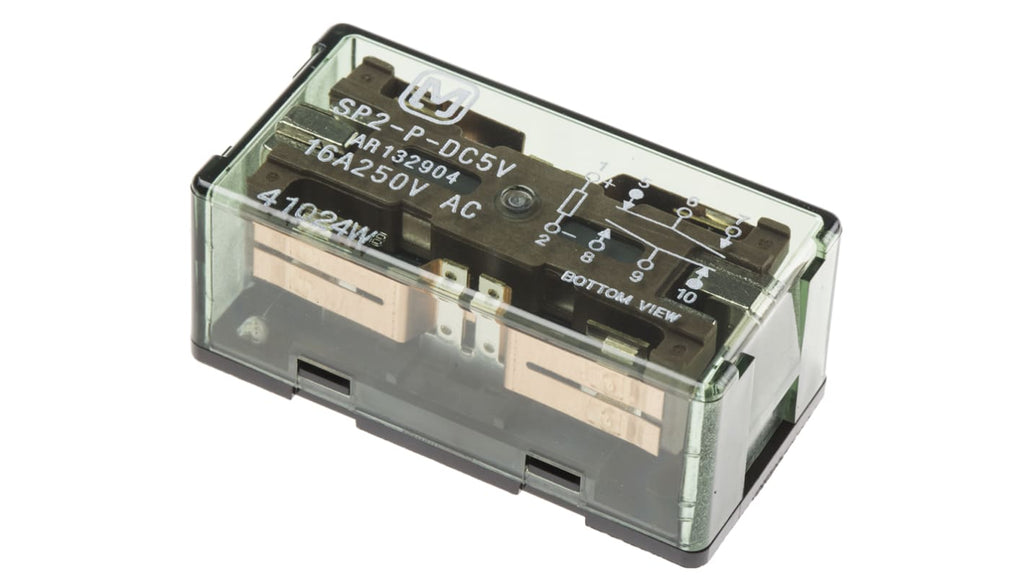 Relè di potenza DPDT per montaggio su circuito stampato, tensione bobina 5V cc, corrente di commutazione 15A, potenza bobina 300 mW, resistenza bobina 83Ω, dimensioni 22 x 50 x 25,6 mm, vita 50.000.000 cicli elettrici, temperatura operativa da -50 a +60 gradi Celsius, isolamento bobina-contatto 3kV RMS, materiale contatto lega di argento, potenza di commutazione massima CA 3,75 kVA, potenza di commutazione massima CC 300 W.