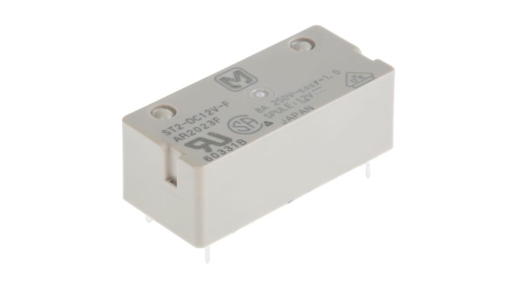 Relè di potenza Panasonic, DPST, bobina 12V cc, montaggio su circuito stampato. Tensione di commutazione massima CA 380V, CC 250V, corrente di commutazione 8A, potenza di commutazione massima CC 150 W, CA 3,04 kVA. Dimensioni 11 x 14 x 31 mm, resistenza bobina 600Ω, potenza bobina 240mW. Intervallo di temperatura operativa -40°C a +60°C, vita 100000 operazioni, materiale contatto lega di argento. Certificazioni UL, CSA, VDE, SEV.