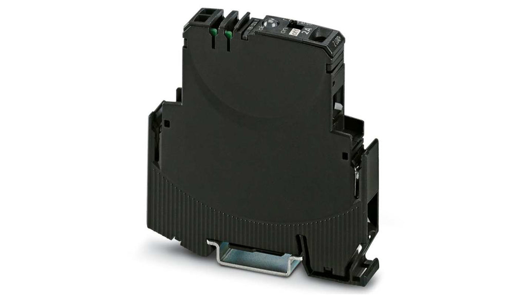 Interruttore elettronico di circuito Phoenix Contact, serie EC, per dispositivi elettronici. Limitazione di corrente elettronica attiva in caso di cortocircuito, spegnimento per sovraccarico, protezione selettiva per circuiti di carico a 24 V c.c. Corrente residua limitata a 1,3 - 1,8 volte la corrente nominale. Progettato per rispondere rapidamente ai sovraccarichi. Codice costruttore 0903033.