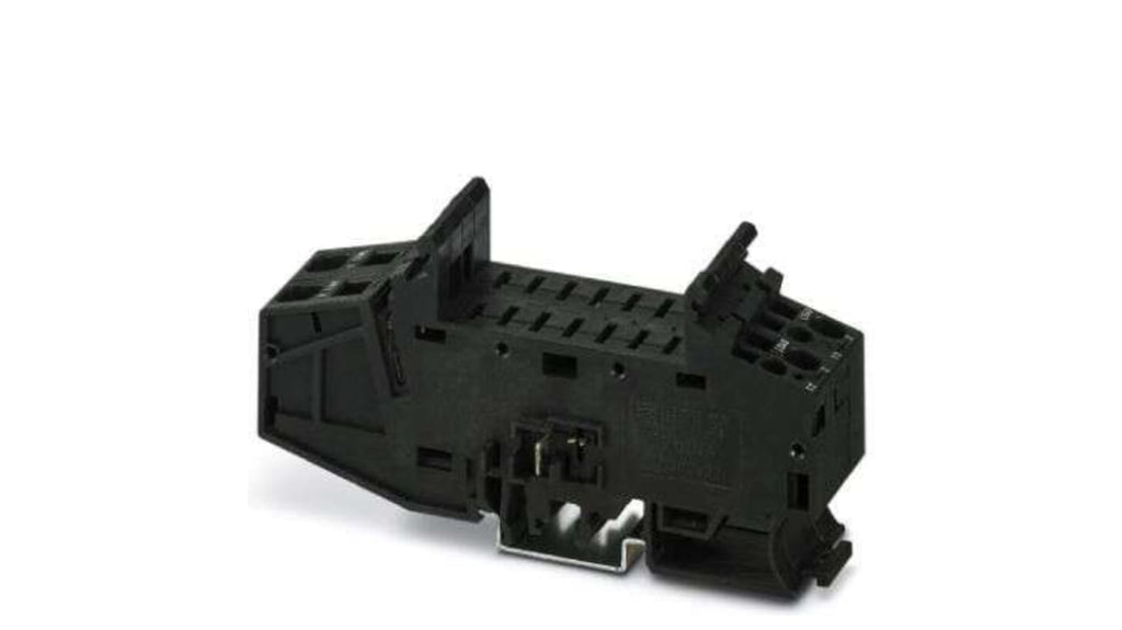 Base di montaggio Phoenix Contact per interruttori automatici con dispositivo termomagnetico, codice costruttore 0916589. Design modulare, due posizioni, espandibile, installazione rapida con cablaggio ridotto, montaggio su guida DIN 35 mm, colore nero, materiale isolante PA-F, corrente nominale in ingresso 50 A, tensione di isolamento nominale 1500 V.