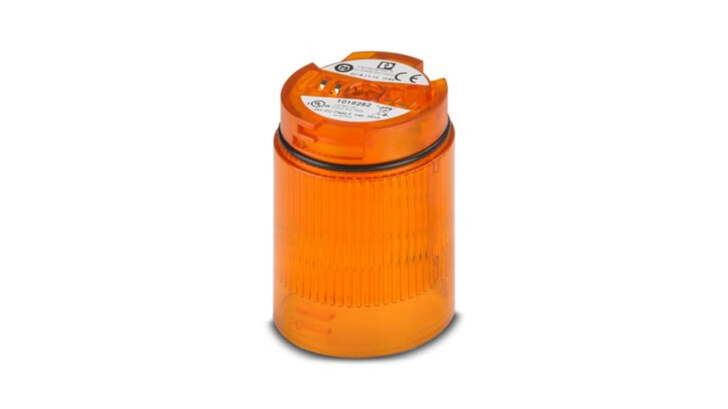 Elemento luminoso lampeggiante per torretta di segnalazione modulare, Phoenix Contact, arancione, 24 V. Combinabile fino a cinque elementi, collegamento meccanico ed elettrico tramite sistema di bloccaggio a baionetta. LED con durata utile minima di 50.000 ore, materiale policarbonato, diametro 50 mm, elevata intensità luminosa. Tipo di lampadina: LED, tensione di alimentazione: 24 V.