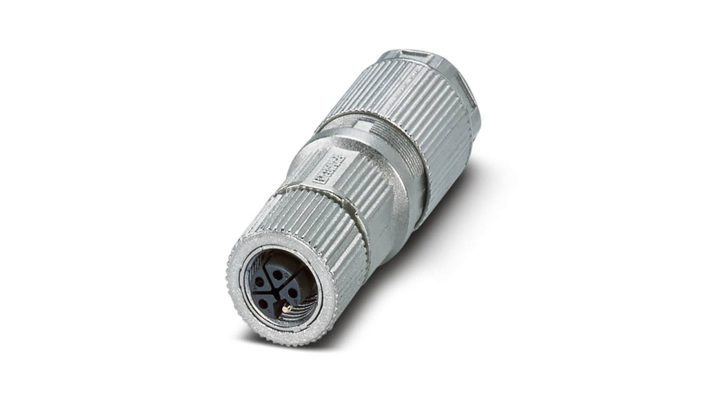 Connettore di potenza femmina 4P, montaggio a pannello, terminazione a vite, corrente nominale 16A, tensione nominale 1,5 kV, serie SACC, design robusto per resistenza a urti e vibrazioni, collegamento schermato per integrità del segnale, guarnizione protettiva per disallineamento, compatibile con vari cavi e conduttori, progettato per applicazioni industriali e ferroviarie. Marchio Phoenix Contact.