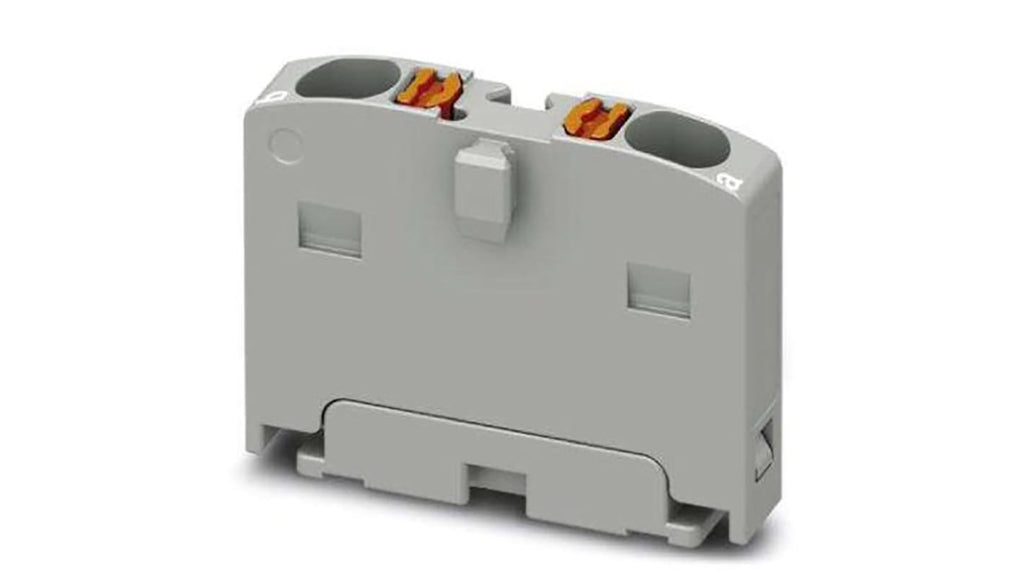 Blocco di distribuzione Phoenix Contact, 2 vie, corrente nominale 17,5 A, tensione nominale 450 V, terminazione a inserzione, dimensione cavo 2,5 mm², materiale custodia poliammide, colore grigio, montaggio su guida DIN, protezione di isolamento, resistenza agli urti, classificazione di infiammabilità UL 94 V0. Codice costruttore 1045923.