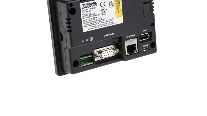 Interfaccia operatore touch screen, display a colori 4,3 pollici, risoluzione 480x272 pixel, processore ARM9 a 454 MHz, memoria onboard 128 MB, grado di protezione IP20 e IP66, tensione di alimentazione 24 V c.c., dimensioni 120 x 5 x 89 mm, supporto per Ethernet RJ45, retroilluminazione presente, temperatura operativa da 0 a 50 gradi Celsius, compatibile con vari protocolli di comunicazione. Codice produttore 1050387.