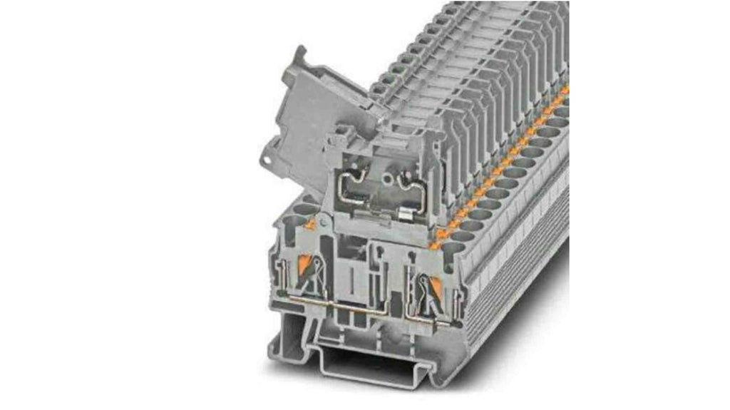 Morsetti portafusibili componibili Phoenix Contact, colore grigio, livello singolo, con fusibile. Corrente nominale 6,3 A, tensione nominale 500 V. Metodo di collegamento a innesto, sezione trasversale da 0,2 mm² a 6 mm². Tipo di fusibile G / 5 x 20. Larghezza 6,2 mm. Modello PT 4-HESI (5X20) GY/GY. Non parte della gamma "complete Line".