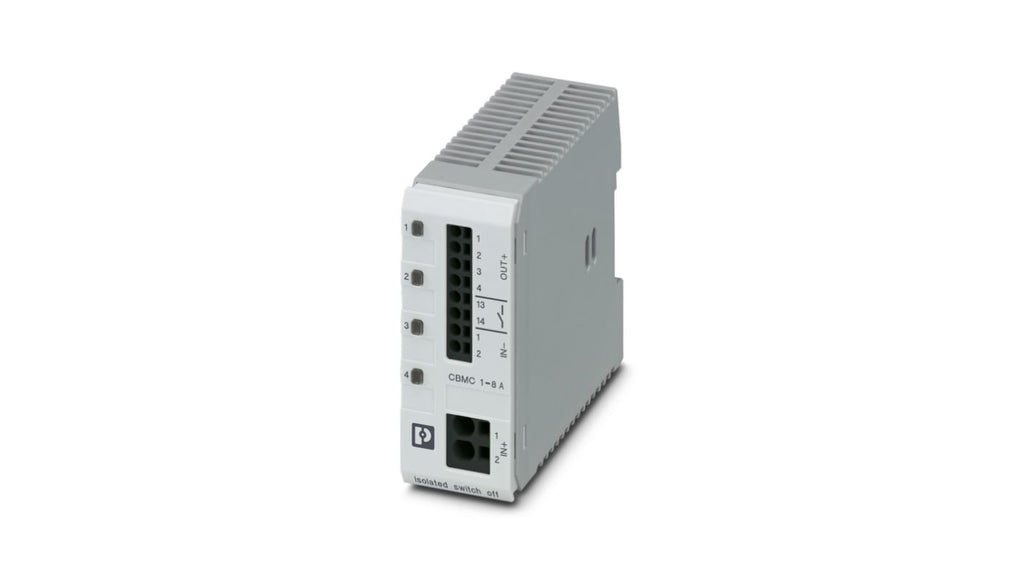 Interruttore elettronico di circuito, corrente nominale 8A, tensione 24V CC, 1 canale, montaggio su guida DIN, serie CBMC. Design compatto, facile sostituzione senza ripianificazione, isolamento elettrico per maggiore sicurezza, blocco elettronico contro regolazioni involontarie, LED di stato per monitoraggio operativo. Dimensioni: 90mm x 36mm x 98mm. Codice costruttore 1065730, marchio Phoenix Contact.
