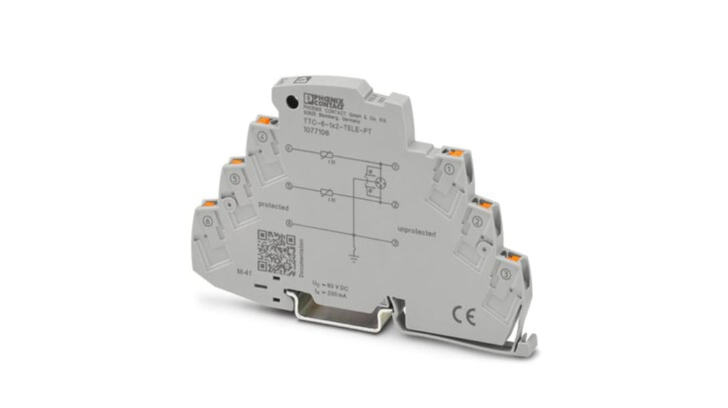 Dispositivo di protezione da sovracorrente per guida DIN. Marchio Phoenix Contact, codice 1077106. Protezione contro le sovratensioni, corrente massima di sovraccarico 10kA, fase elettrica 1. Montaggio su guida DIN, serie TTC, gamma TERMITRAB. Installazione rapida senza utensili, meccanismo di cortocircuito integrato, limitatore di corrente elettronico. Larghezza totale 6,2 mm.
