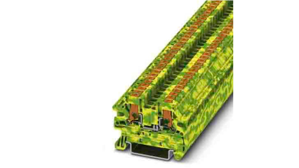 Morsettiera passante modulare Phoenix Contact, design compatto, colore verde e giallo, livello singolo. Terminale PTV 2.5-PE, AWG 26 a 12 e 26 a 14, cavo CSA 0.14 a 2.5 mm² e 0.14 a 4 mm². Temperatura operativa da -60 a +105 gradi Celsius, certificazioni ATEX e IECEx, standard IEC 60947-7-2, corpo in poliammide, inserzione verticale del cavo.