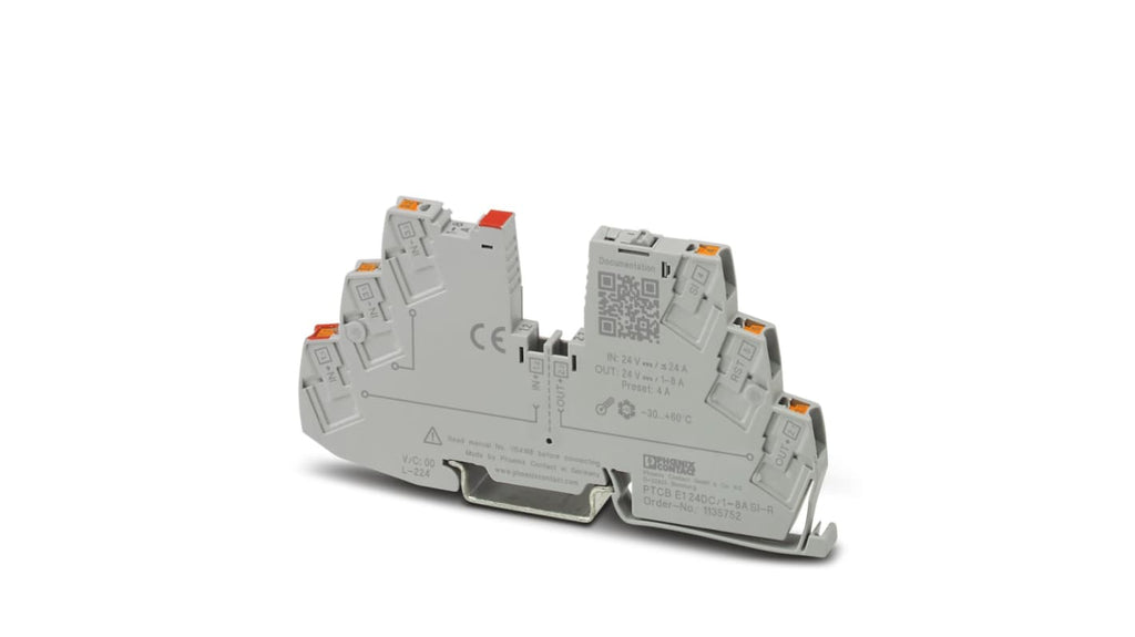 Interruttore elettronico di circuito, 24A, 24V, 1 canale, PTCB E1. Marchio Phoenix Contact. Larghezza totale 6 mm, collegamento a ponte al sistema CLIPLINE, impostazioni da 1 a 8 A, telecomando con segnalazione remota, display a LED per stato di funzionamento, tecnologia di collegamento a innesto.