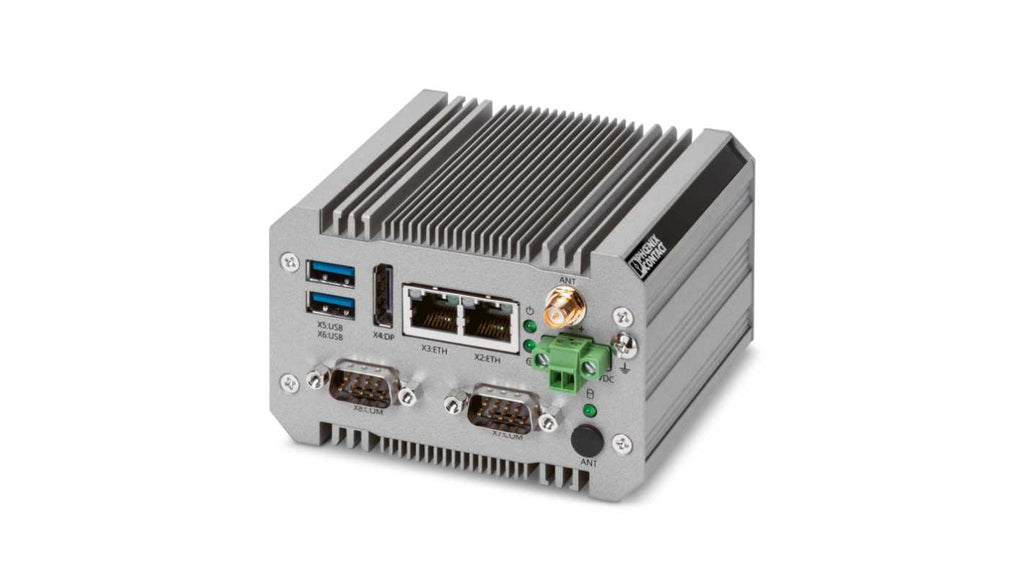 Computer industriale senza ventola Phoenix Contact, processore Intel Celeron N3350, RAM 32 GB, archiviazione eMMC e SSD M.2 64 GB, 2 porte COM, sistema operativo Windows 10 Enterprise 2019 LTSC, raffreddamento passivo, montaggio su guida DIN, dimensioni 99 x 92 x 63 mm, grado di protezione IP30, alimentazione 24 V, batteria BR2032. Codice costruttore 1158241.