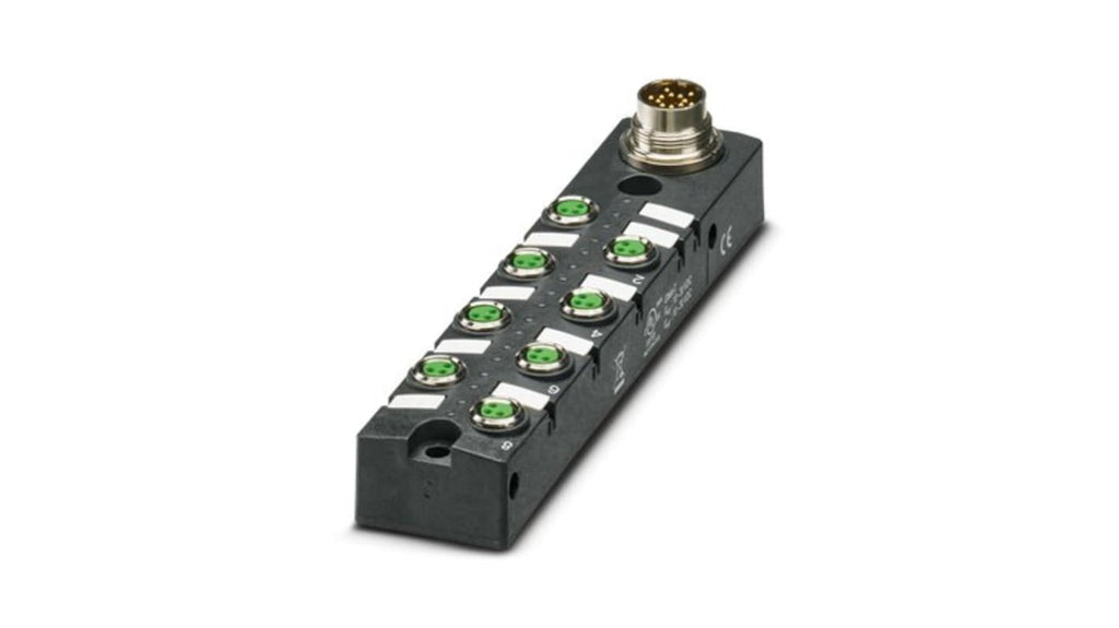 Scatola sensore/attuatore Phoenix Contact, 8 porte, 3 vie, con connettore M8. Tensione nominale 24 V c.c., corrente nominale totale 6 A. Materiale contatto CuZn, contenitore sagomato con elevato grado di protezione. Diagnostica semplice per maggiore disponibilità della macchina. Riconoscimento UL, cUL, cULus.