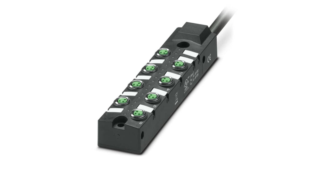 Scatola sensore/attuatore con 8 porte, 3 vie, connettore M8, cavo da 5 m. Tensione nominale 24 V c.c., corrente nominale totale 6 A. Materiale contatto CuZn, contenitore sagomato, elevato grado di protezione. Diagnostica semplice per maggiore disponibilità macchina. Riconoscimento UL, cUL, cULus.