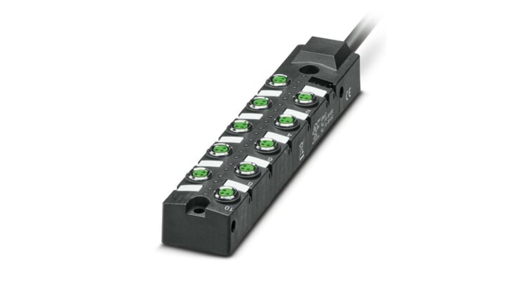 Scatola sensore/attuatore Phoenix Contact, 10 porte, 3 vie, connettore M8, cavo da 10 m, materiale contatto CuZn, tensione nominale 24 V c.c., corrente nominale totale 6 A, contenitore sagomato, elevato grado di protezione, diagnostica semplice, riconoscimento UL/cUL/cULus.
