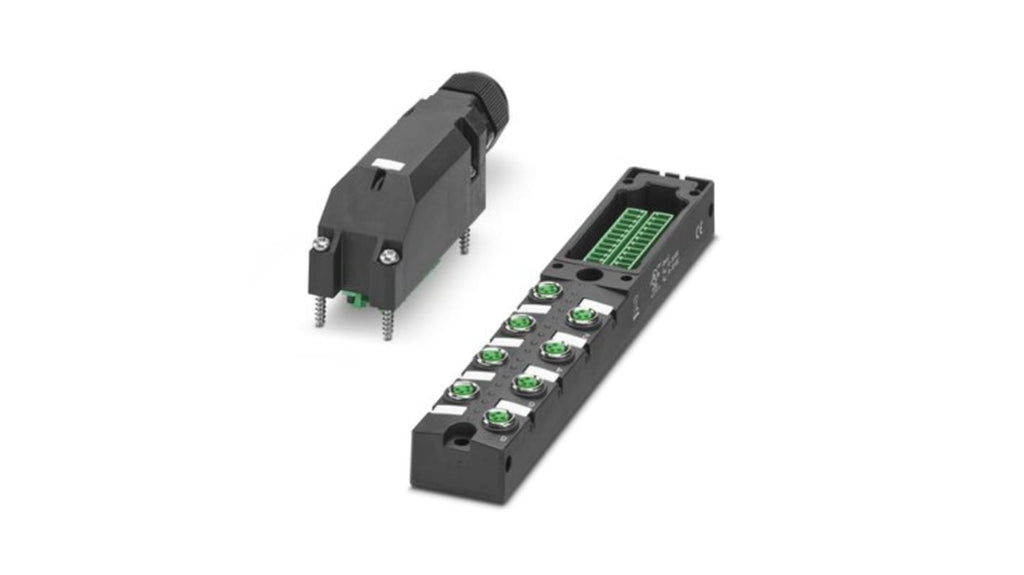 Scatola sensore/attuatore Phoenix Contact, 8 porte, 4 vie, con connettore M8. Tensione nominale 24 V c.c., corrente nominale totale 8 A. Materiale contatto CuZn, contenitore sagomato con elevato grado di protezione. Assemblaggio in loco con calotta per connettore, doppia occupazione per due sensori in uno slot. Riconoscimento UL, cUL, cULus. Serie SACB.