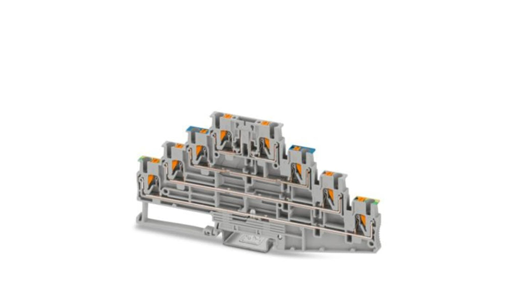 Morsettiera di terra Phoenix Contact, 4 vie, con connessione push-in, progettata per messa a terra sicura in ambienti industriali. Sezione cavo da 0,14 a 4 mm², cavo CSA 2,5 mm², guida DIN, materiale custodia in poliammide, colore grigio, numero di connessioni 8, conformità RoHS. Codice costruttore 1336374.