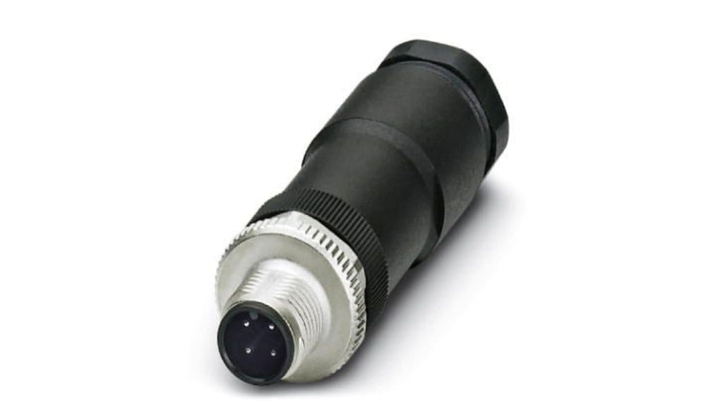 Connettore circolare maschio, serie SACC, M12, 4 poli, montaggio su cavo. Collegamento a vite, protezione IP67, orientamento ad angolo diritto, codifica A. Progettato per applicazioni di alimentazione, garantisce un collegamento rapido e affidabile senza anelli di cavo superflui. Codice costruttore 1404415, marchio Phoenix Contact.