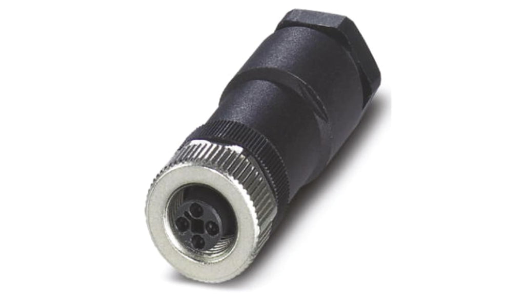 Connettore circolare femmina M12, 4 poli, montaggio su cavo, serie SACC. Corrente nominale 12 A, tensione nominale 60 V, grado di protezione IP67. Materiale custodia in polimero, contatti in rame placcati oro. Dimensioni 60,4 x 20 x 20 mm, temperatura operativa da -40 a +85 gradi. Codifica a T per evitare collegamenti errati, riutilizzabile fino a 100 volte. Codice costruttore 1404644.