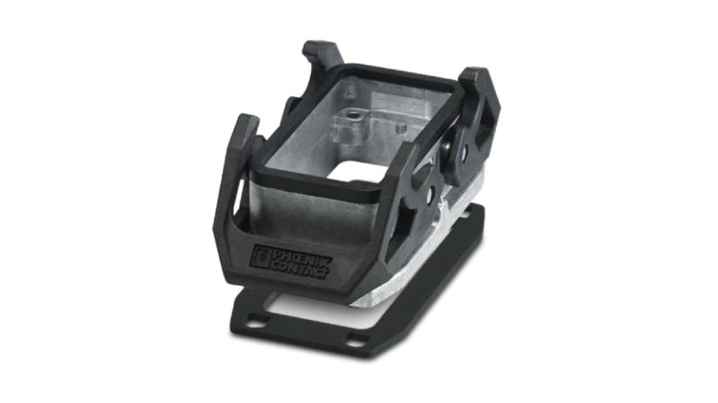 Contenitore per montaggio a pannello HEAVYCON B10, doppio blocco di bloccaggio, guarnizione piatta, alluminio resistente all'acqua salata, guarnizione del profilo conduttiva, buona schermatura contro interferenze elettromagnetiche. Serie HC-STA-B10-BWD-ELC-AL, codice costruttore 1411322, marchio Phoenix Contact.