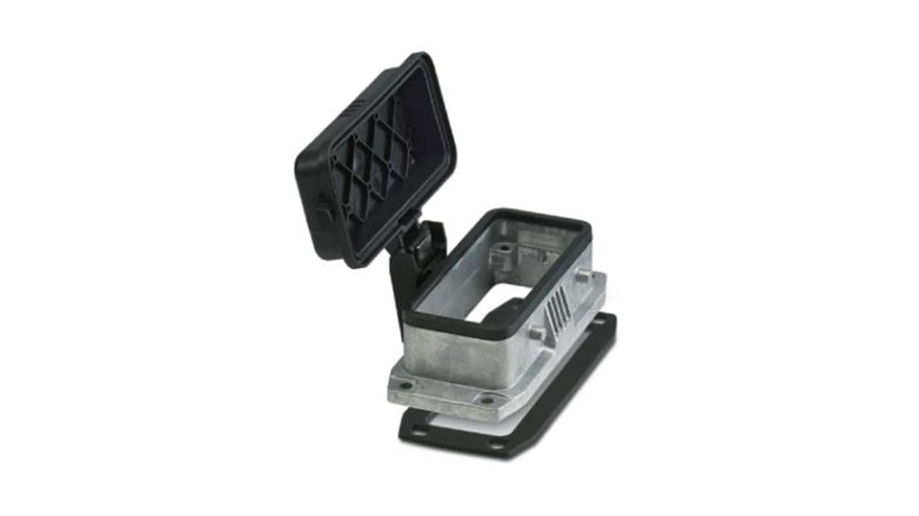 Contenitore per montaggio a pannello HEAVYCON B16, doppia chiusura di bloccaggio, coperchio protettivo in plastica, guarnizione piatta, alluminio resistente all'acqua salata, guarnizione del profilo conduttiva, buona schermatura contro interferenze elettromagnetiche. Serie HC-STA-B16-BFDC-ELC-AL, codice costruttore 1411328, marchio Phoenix Contact.